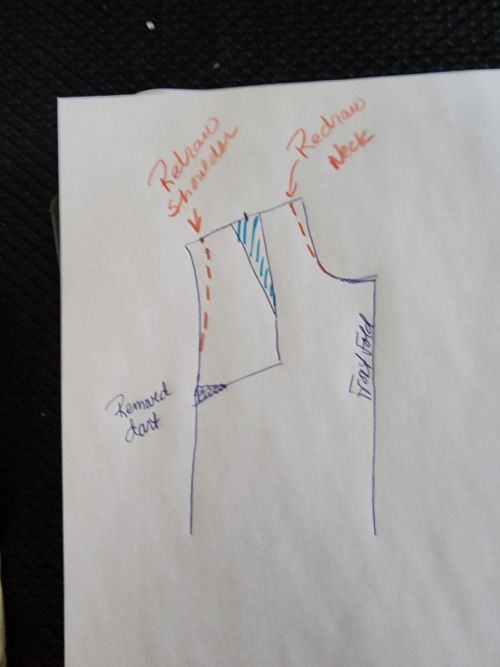 First, Andi closed the dart using classic dart rotation theory and sent it into the shoulder. By doing this, she still had the extra width and length from the CD front she needed in the bust area. My next instruction did not make sense to her, so she tried something and sent me a photo to confirm it was going to work.