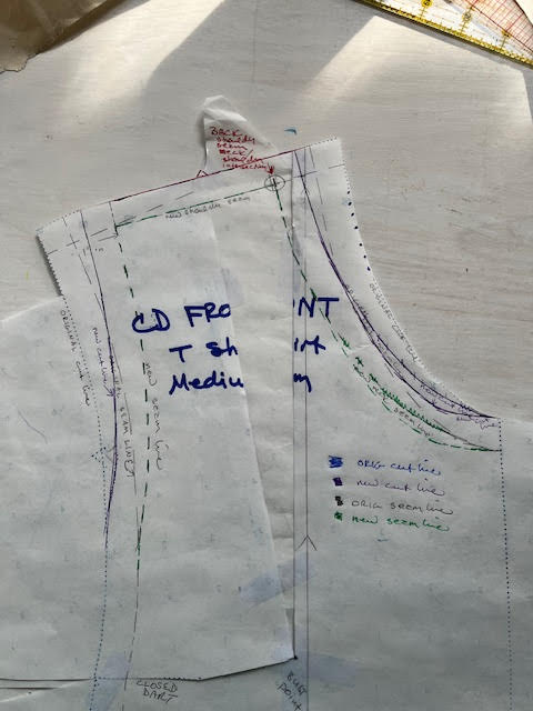 After seeing her in the new mock-up, a large sleeve adjustment did not seem in order, but because she was confused by my proposed alteration, we sketched our way through her questions. This is a very counter-intuitive adjustment that is unique to the square armhole configuration, so no surprise that it required a bit more conversation. I assured her that it is odd, but by adding in the underarm seam, you get the option of adding almost 3” in the upper arm. This adjustment was used early on in the life of the Knit pattern by our friend Marie. You can read about it and see it with written and photographic steps in a previous blog post: An Improved Fit!