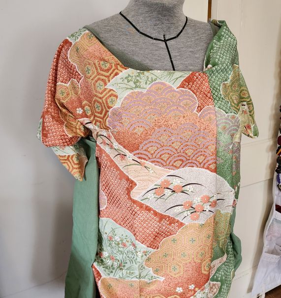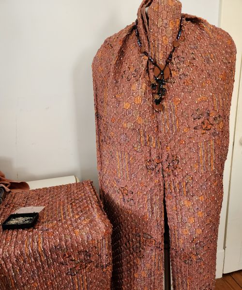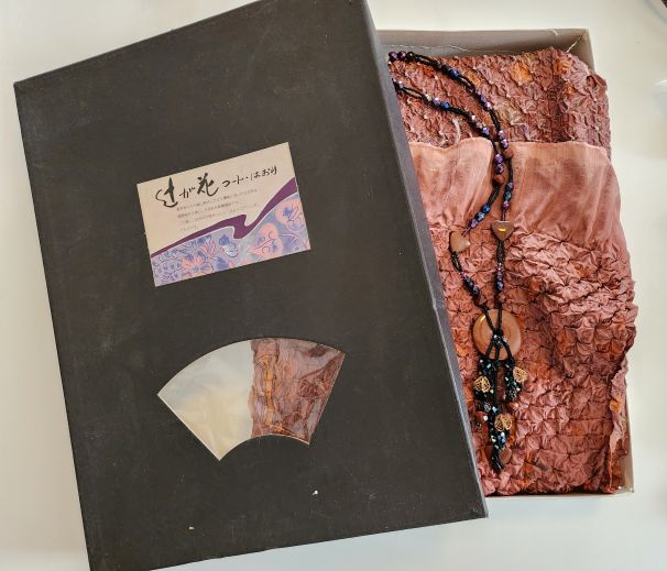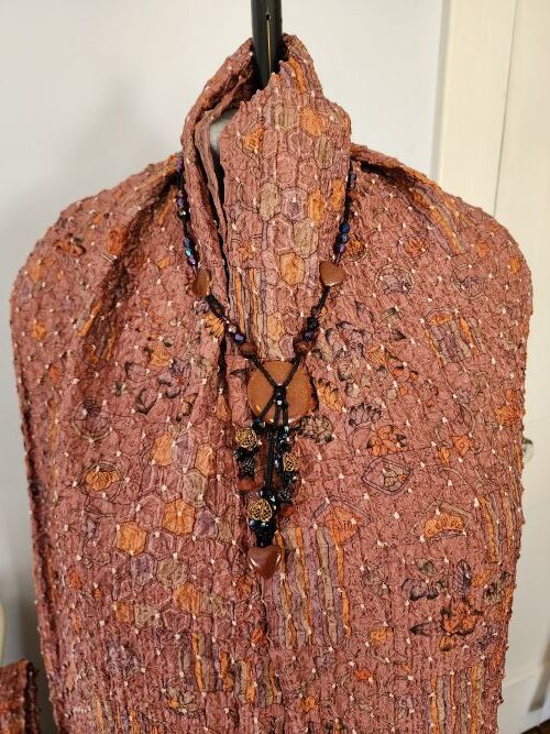 After lunch, I removed the lovely cottons and took some precious silk Shibori out of a souvenir box. These colors are great for my fall wardrobe. With a September wedding on the calendar, it might be just the fabric for a new wardrobe addition. Don’t you love it with this necklace I cherish?
