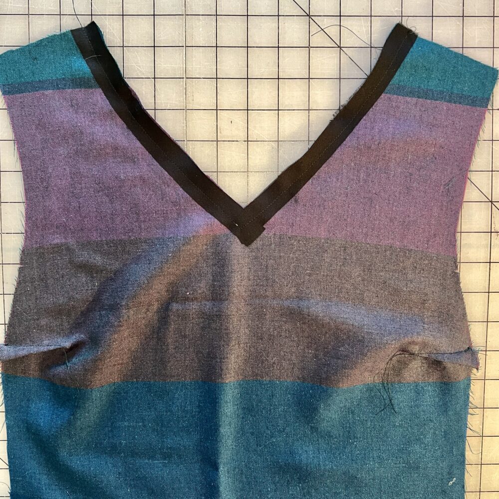 It is important to support both the neckline and collar to maintain their shape. As directed on page 7 of V-Neckline Instructions, provide support for the front V-neckline with a small piece of interfacing at the point of the V or, if the fabric is especially stretchy, soft or fragile, with a 1” wide strip of fusible interfacing along both sides of the V. Stay stitch the front and back necklines.
