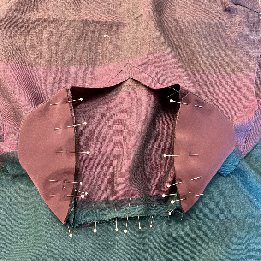 Next, pin and baste the facings into place as directed in the Carpe Diem Instructions. After ensuring that the facings are inserted smoothly, restitch with regular length stitches. Grade and clip all seam allowances around the neckline to reduce bulk and ensure that the curved collar lies smoothly. Finally, under stitch the collar and neckline seam allowances to the facings to hold everything securely in place.