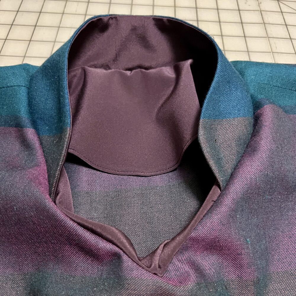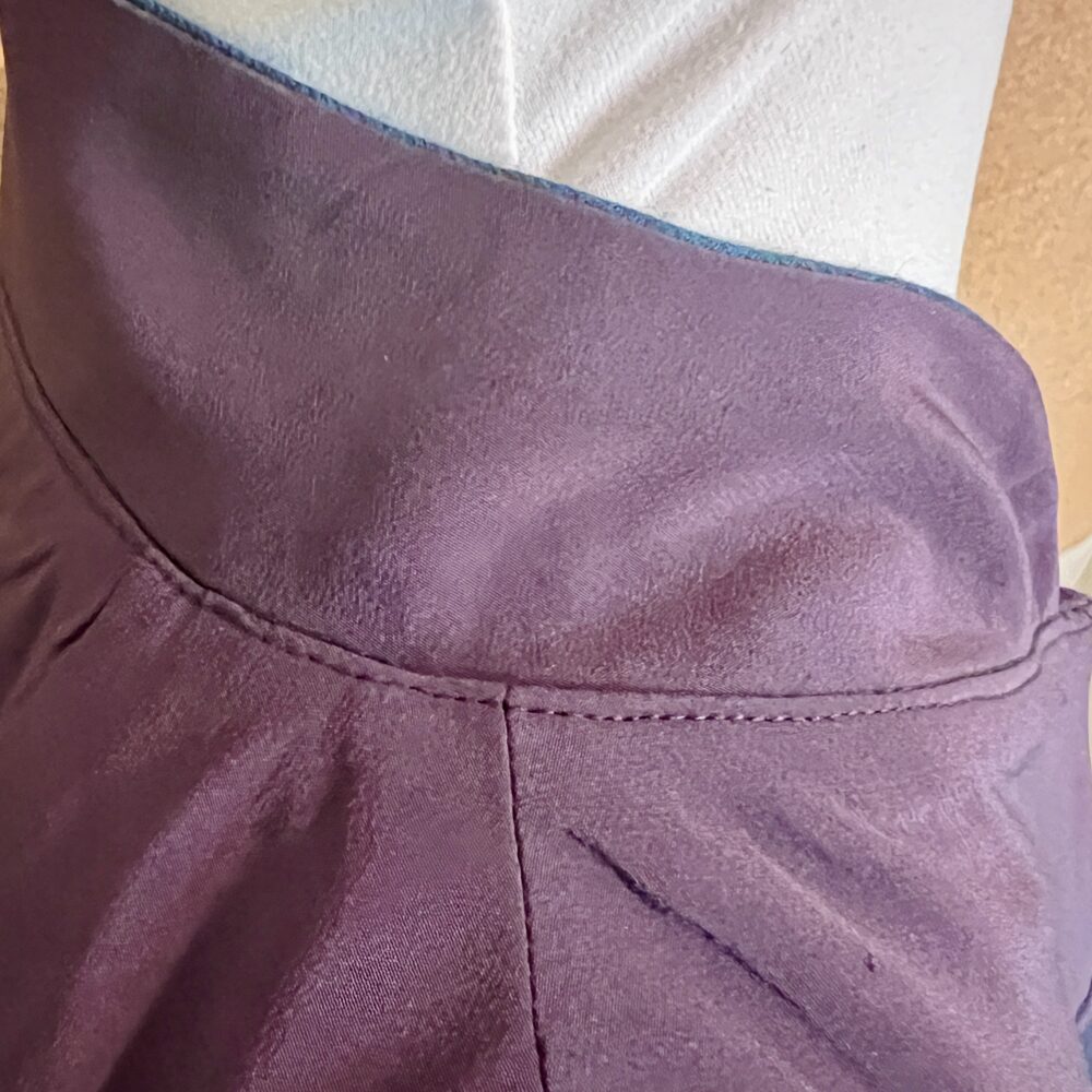 Whether you are planning a Carpe Diem with a closed back or with a zipper or keyhole opening will determine whether you are preparing a single collar joined at center back or separate right and left collars. When choosing, consider whether you will be comfortable pulling a closed back garment with collar on over your head and shoulders. You may also decide to cut the outer collar and inner collar (or collar lining) out of the same or different fabrics. Carrie lined the collar of her wool tunic with silk scraps to prevent itching, but the rayon top uses the same fabric for both inner and outer collars.