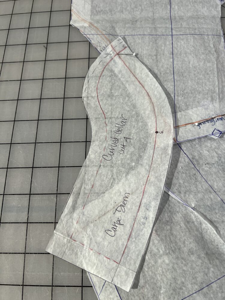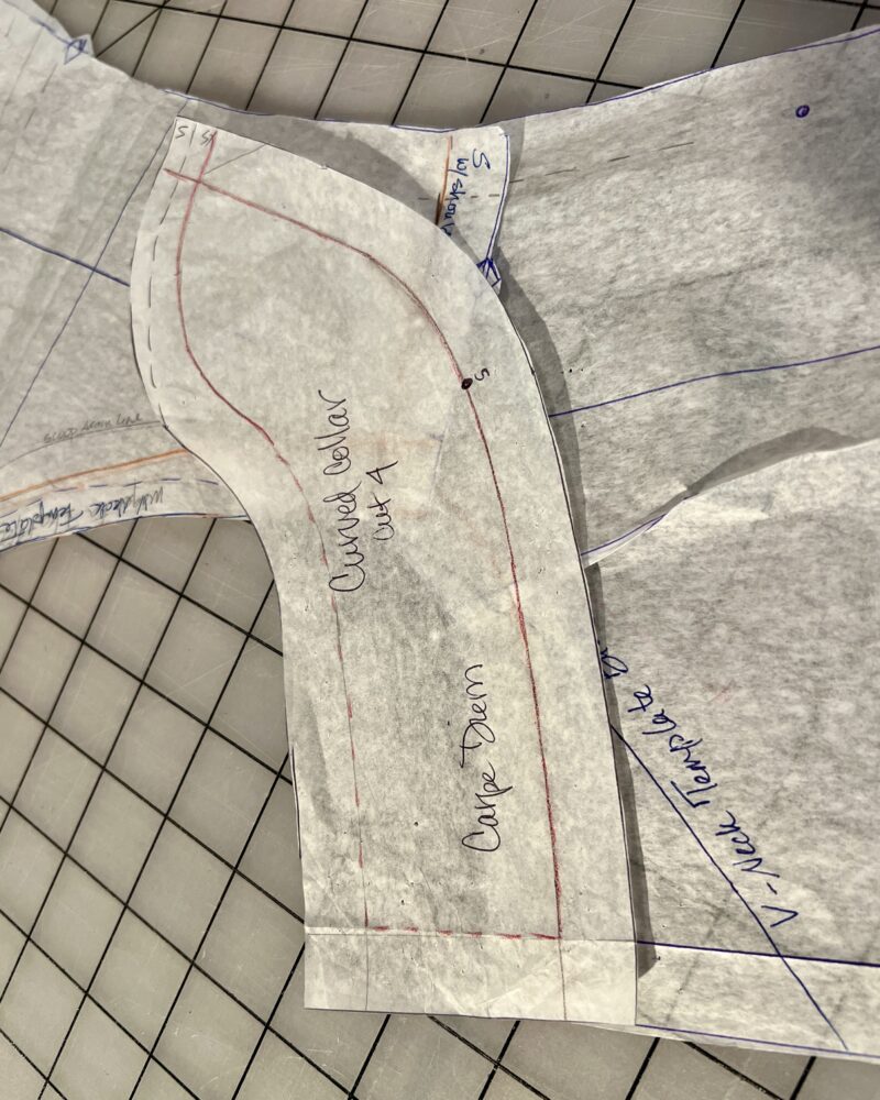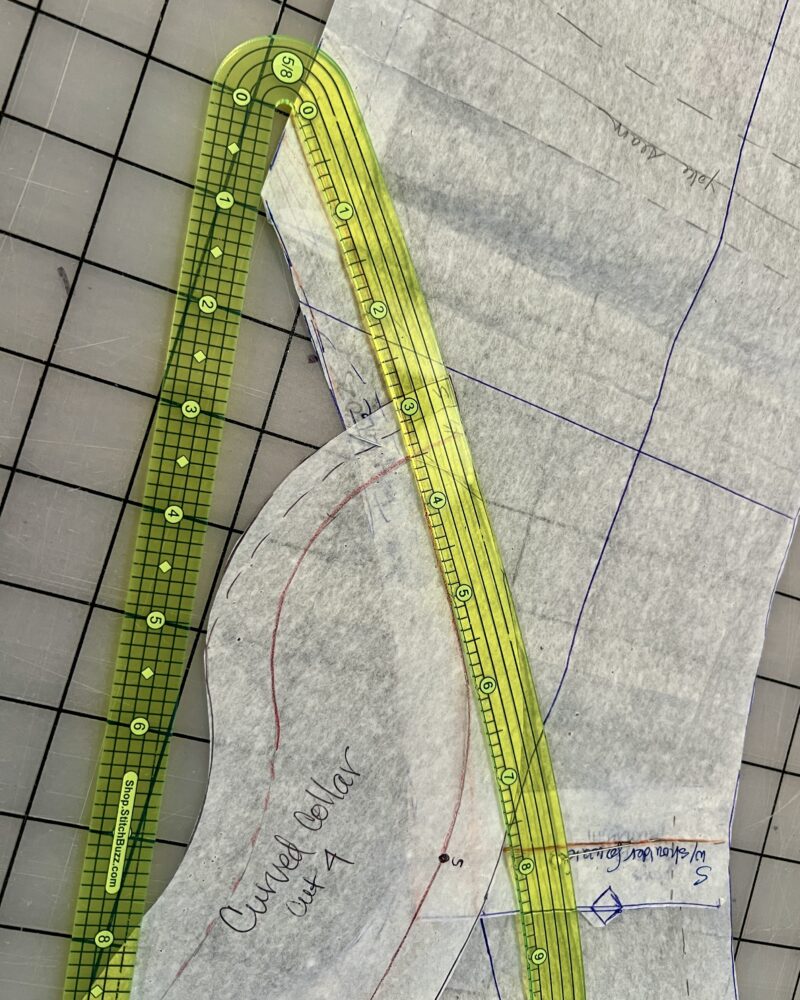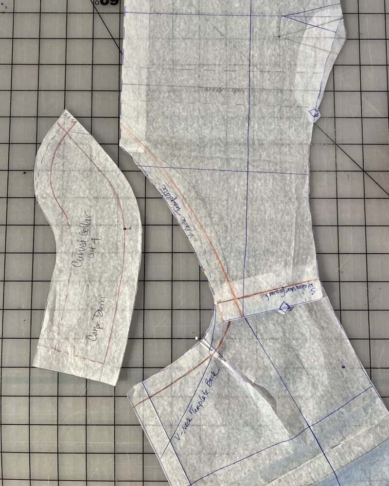On the Curved Collar pattern, pencil in a 5/8” seam line along the long outer curve, continuing a few inches at the point to the shorter inner curve. Starting with the short square edge of the collar pattern at the edge of the back pattern piece, align the penciled seam lines and slowly walk along the back neck and around the shoulder to the front neckline. The dot on the collar pattern should be placed at the point where the shoulder seams overlap, so move the dot if needed. Next, observe where the point of the collar lands along the front neckline; ideally it will be about 3-4” from the finished point of the V.