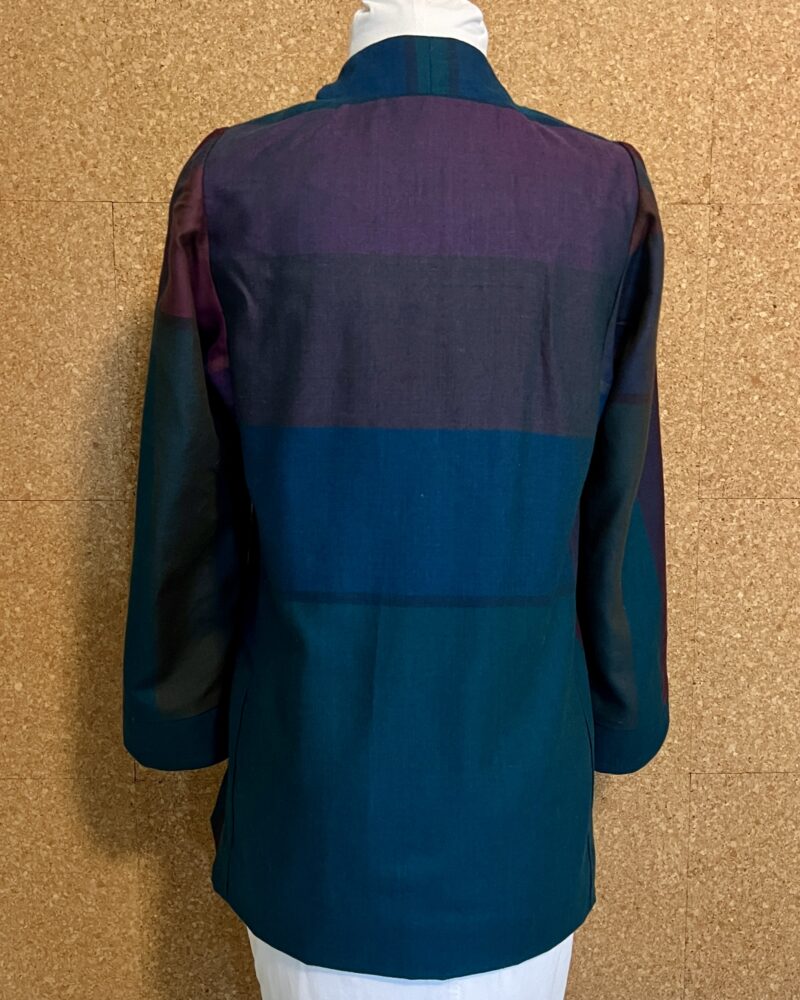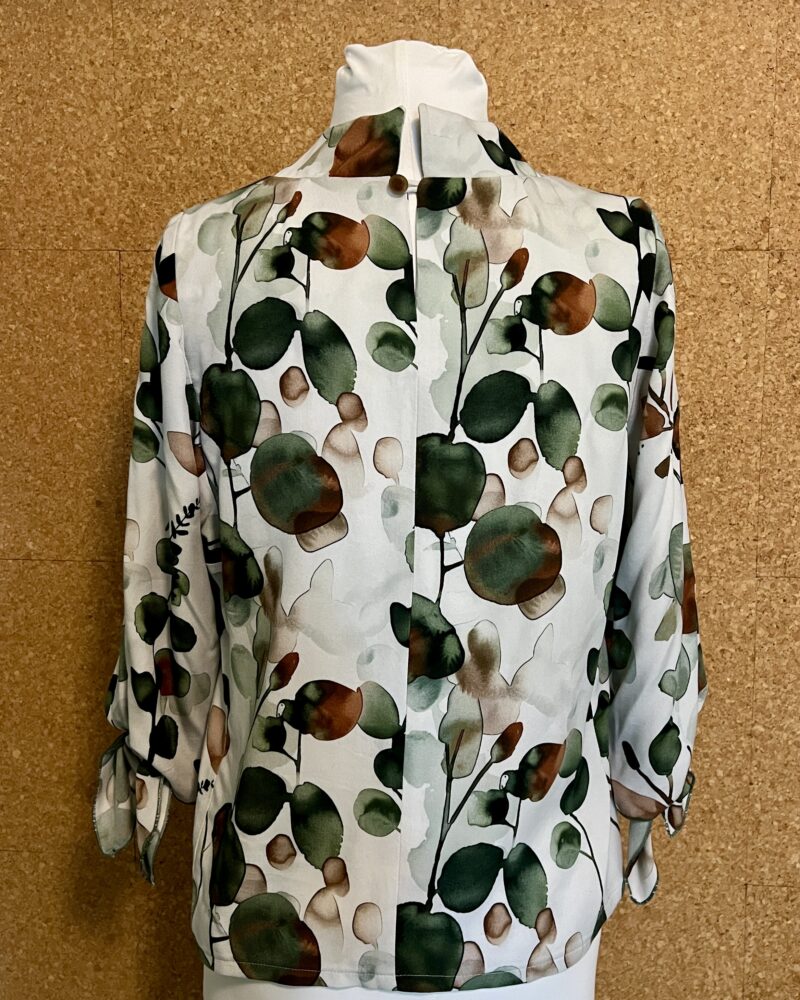 Today we take a closer look at how to add a Curved Collar to a V-Neckline Carpe Diem Dress or Tunic. The collar and V-front work together to gracefully frame the wearer’s face, making this a very flattering style for a transitional or cool-weather top or dress. Read on for tips on how to fit, prepare, and insert the collar into a V-Neck garment. Carrie will illustrate with photos from two tops, the Eucalyptus Top in rayon with self-facings and a keyhole back opening and the Wool Tunic with a closed back and complementary silk facings and collar lining.