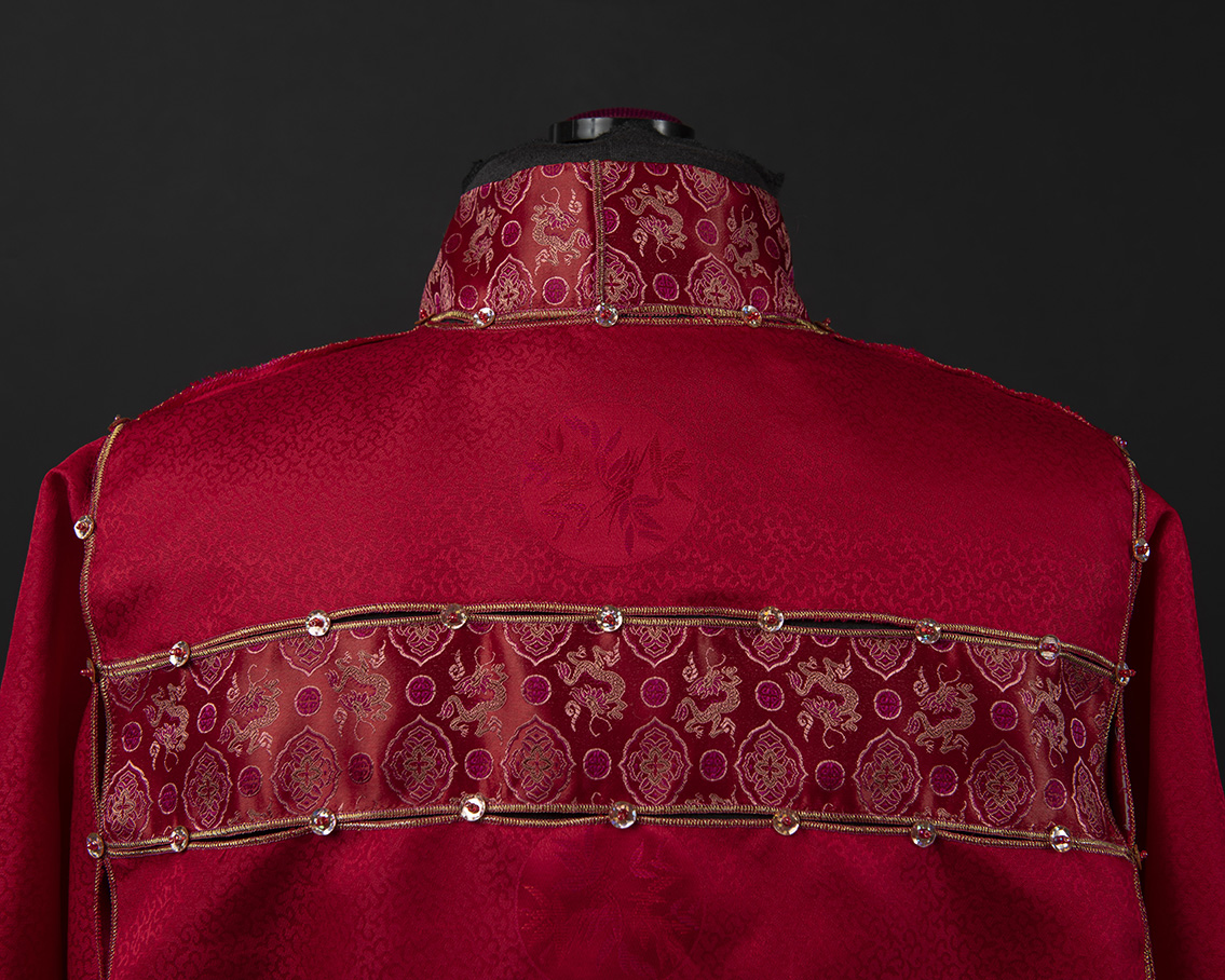 Rae created this holiday top for an article she was writing for Threads Magazine issue #212, Beaded Connections (Dec. 2020-Jan. 2021). While it is based on the Tabula Rasa Jacket pattern, is constructed by an unusual process. Learn more about the technique in Rae’s blog post Bead the Seams for Festive Garments and in the Threads Insider extra, Bridge Seams with Beads and Sequins. This red silk gazaar top features a staggered hemline as well as the rolled edge and beaded seams.
