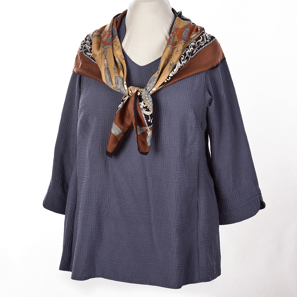 A lovely top all by itself or with a colorful scarf at the neck, this top was the original sample of the collar version of the Carpe Diem V Neckline Variations pattern. The expansion pack includes the new neckline, soft curved collar, and curved cuffs for a tailored and tidy look. Rae used a pintucked rayon with lovely drape to make this tunic which is longer than the actual tunic length and shaped through the waist leaving a bit of fullness around the hem. It is a great basic to show off her scarf collection. Read more about the V Neckline variations in this introductory blog post.