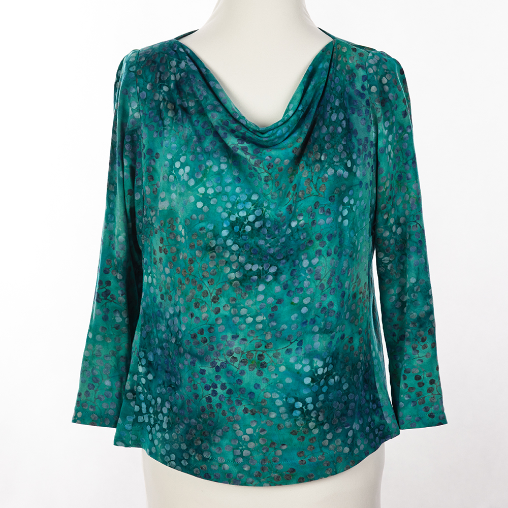 This simple knit tee features a Draped Front from Wide Neckline Variations for Tabula Rasa Knits. Carrie chose to sew it with SewBatik’s new viscose jersey knit because it has more drape than the batik cotton knit jersey. The soft colors in Gardenista Vine – Ocean Teal are just yummy and coordinate with many garments in Carrie’s wardrobe!