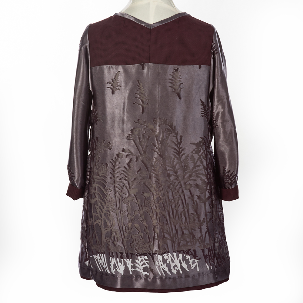 Drapey Rayon Burnout in an unusual grey/purple color was paired with a scrap of dark purple rayon to make this fun Carpe Diem top that showcases a favorite but unused button. The Crossover V neckline is a perfect place to shwacase a dramatic button and Rae thinks this topper is great with leggings for dinner out with friends. There is an added pleat down the front of the skirt to draw attention to the button and allow for some extra movement at the hemline. Two small matching buttons help secure a little pleat at the edge of each sleeve too. The Crossover V neck and back yoke plus details on finishing it with a binding are all found in the V-Neckline Variation Pattern for the Carpe Diem Dress and Tunic Pattern.