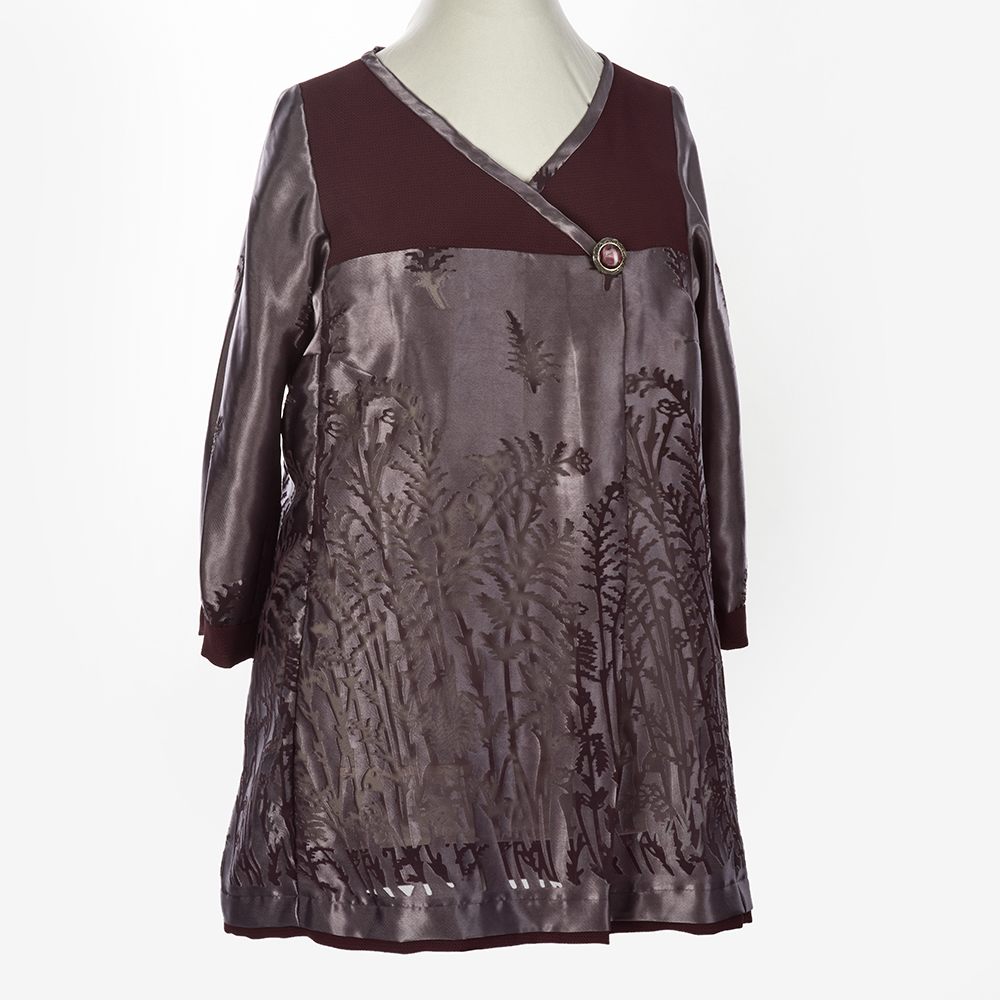 Drapey Rayon Burnout in an unusual grey/purple color was paired with a scrap of dark purple rayon to make this fun Carpe Diem top that showcases a favorite but unused button. The Crossover V neckline is a perfect place to shwacase a dramatic button and Rae thinks this topper is great with leggings for dinner out with friends. There is an added pleat down the front of the skirt to draw attention to the button and allow for some extra movement at the hemline. Two small matching buttons help secure a little pleat at the edge of each sleeve too. The Crossover V neck and back yoke plus details on finishing it with a binding are all found in the V-Neckline Variation Pattern for the Carpe Diem Dress and Tunic Pattern.