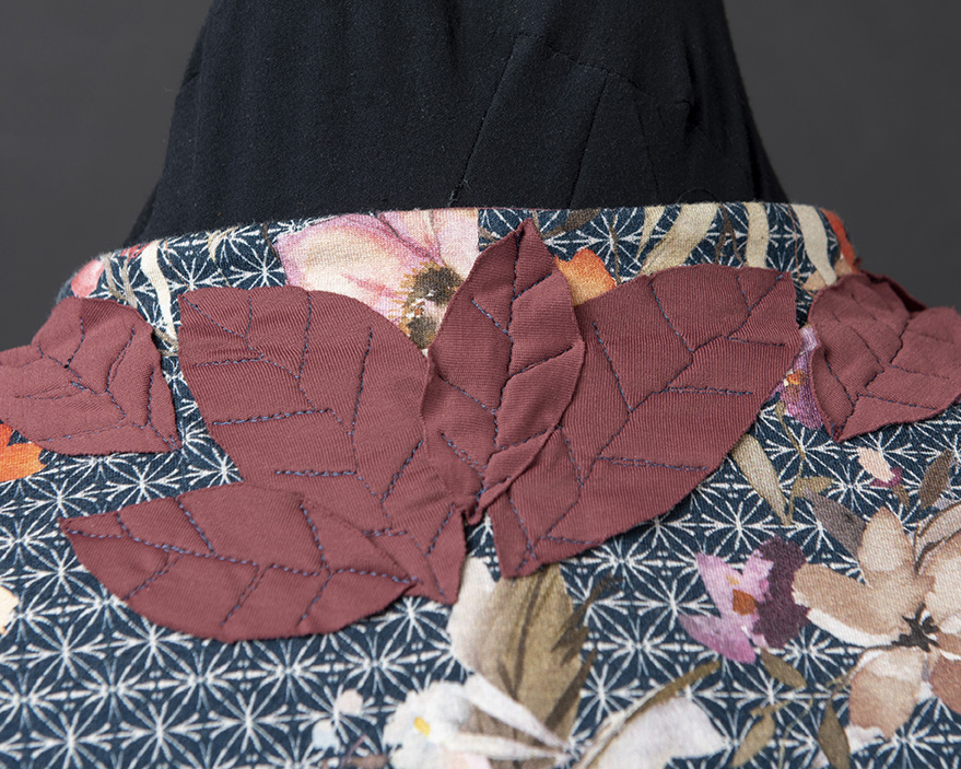 The cuffs and collar were embellished and connected with knit leaves cut from the rust jersey and machine topstitched into place for a fanciful look.