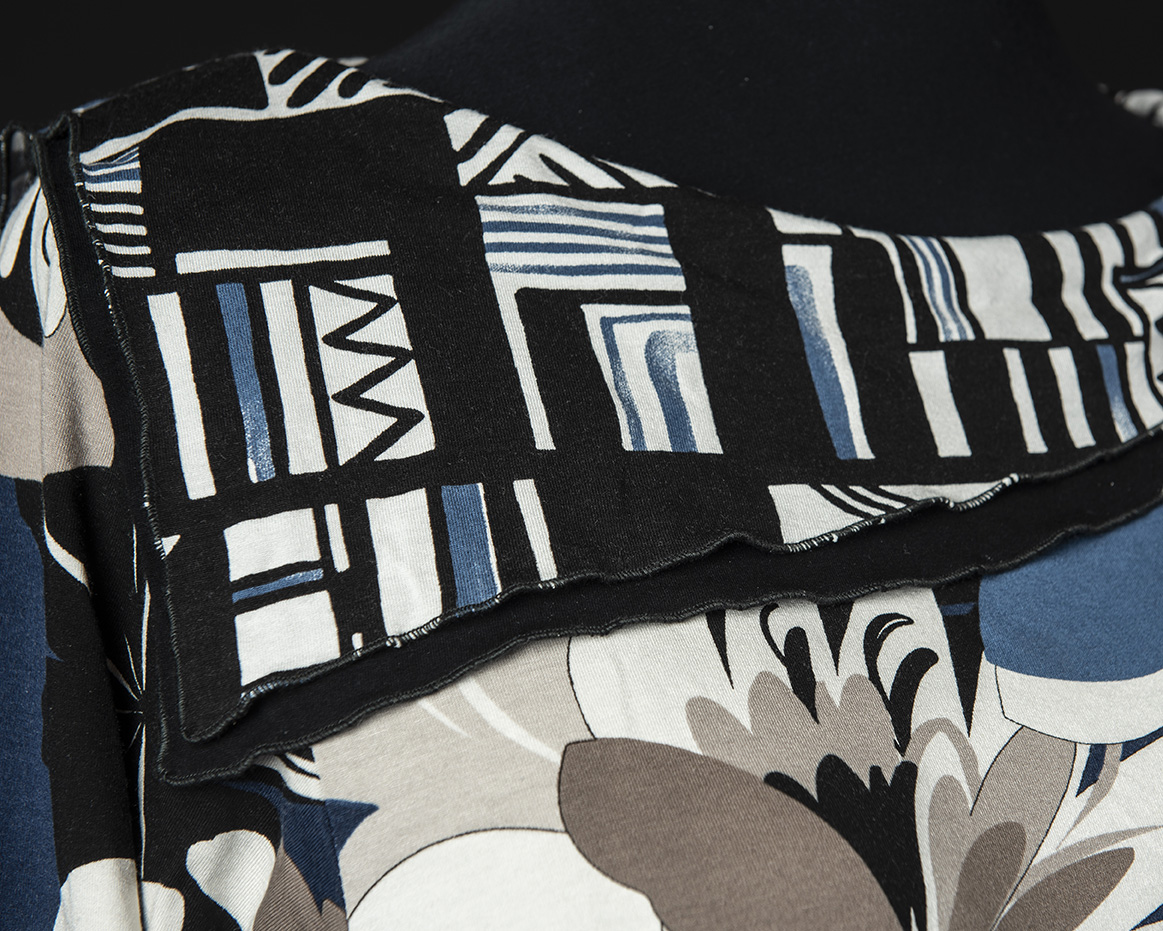 This striking collared knit tee features a gorgeous big floral in blue, black, ivory and shades of taupe combined with a geometric print in the same colors. Rae added 2 layers of cuffs and Angled collars, using solid black as a shadow to separate the two prints, from Wide Neckline