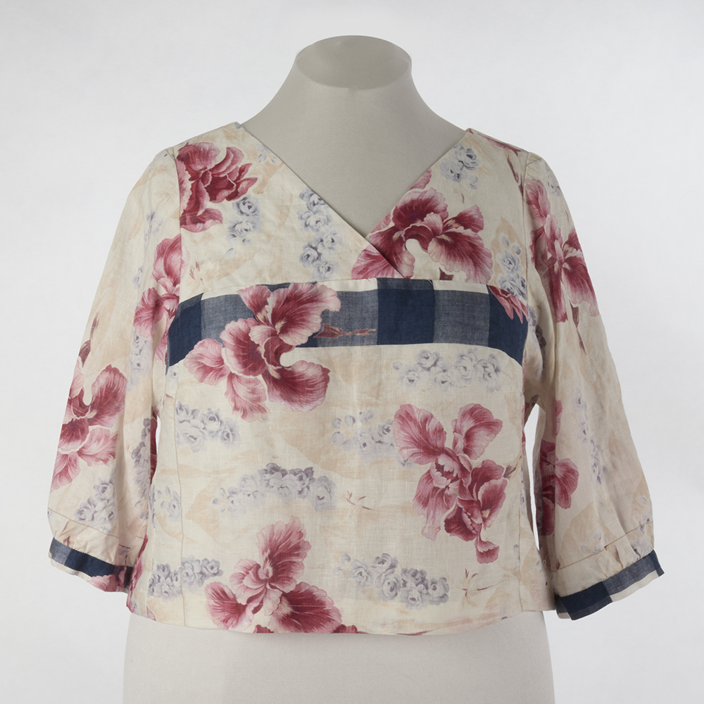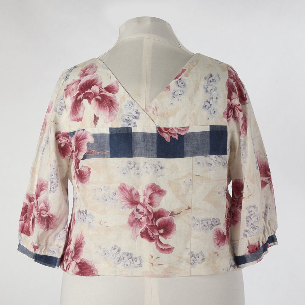 Rae’s first trial of the Crossover V Yoke from V Neckline Variations was sewn into a cropped Carpe Diem top with a busy linen floral print. She carefully cut the lower front and back pieces to include at their upper edges a strip of gingham check that was part of the fabric’s print. She also brought the gingham into the cuffs that complete the slightly gathered sleeves. Like Twirling Parasols, this trial led us to conclude that having the crossover yoke in both the front and back was just a little too much, so the final Back V Yoke has been modified and raised, as seen in the Red Poppy Tunic.
