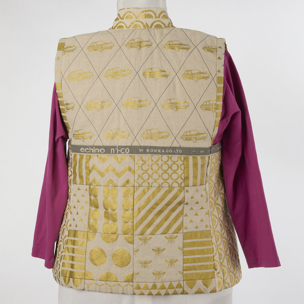 This fun quilted vest was made with the Tabula Rasa Jacket pattern for Classic Sewing Magazine. It features several fun Kokka canvas fabrics and their interesting selvage edges. The selvages finish the top of the vest’s side and provide defination to each pieced line. The piecing is done before the vest sections are quilted and then stitched into a vest. There is a simillarly pieced vest in our recent book Sewing Quilted Patchwork Jackets. It is project #10 Legands, and we discuss it in the blog.