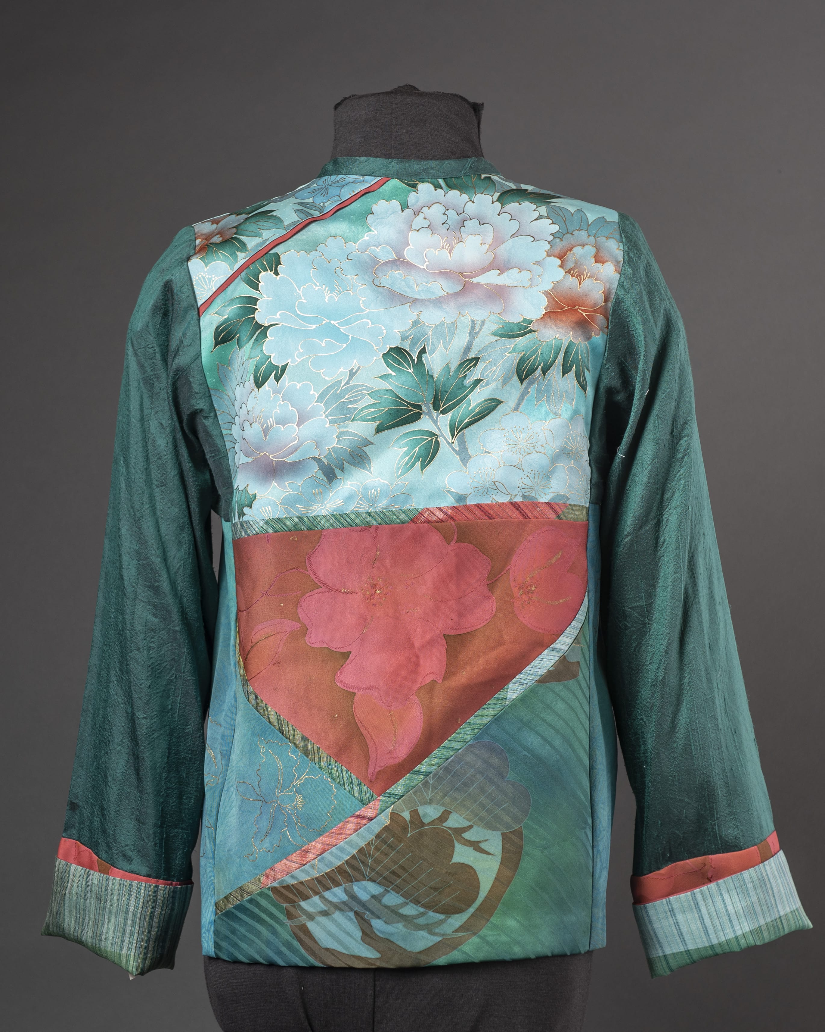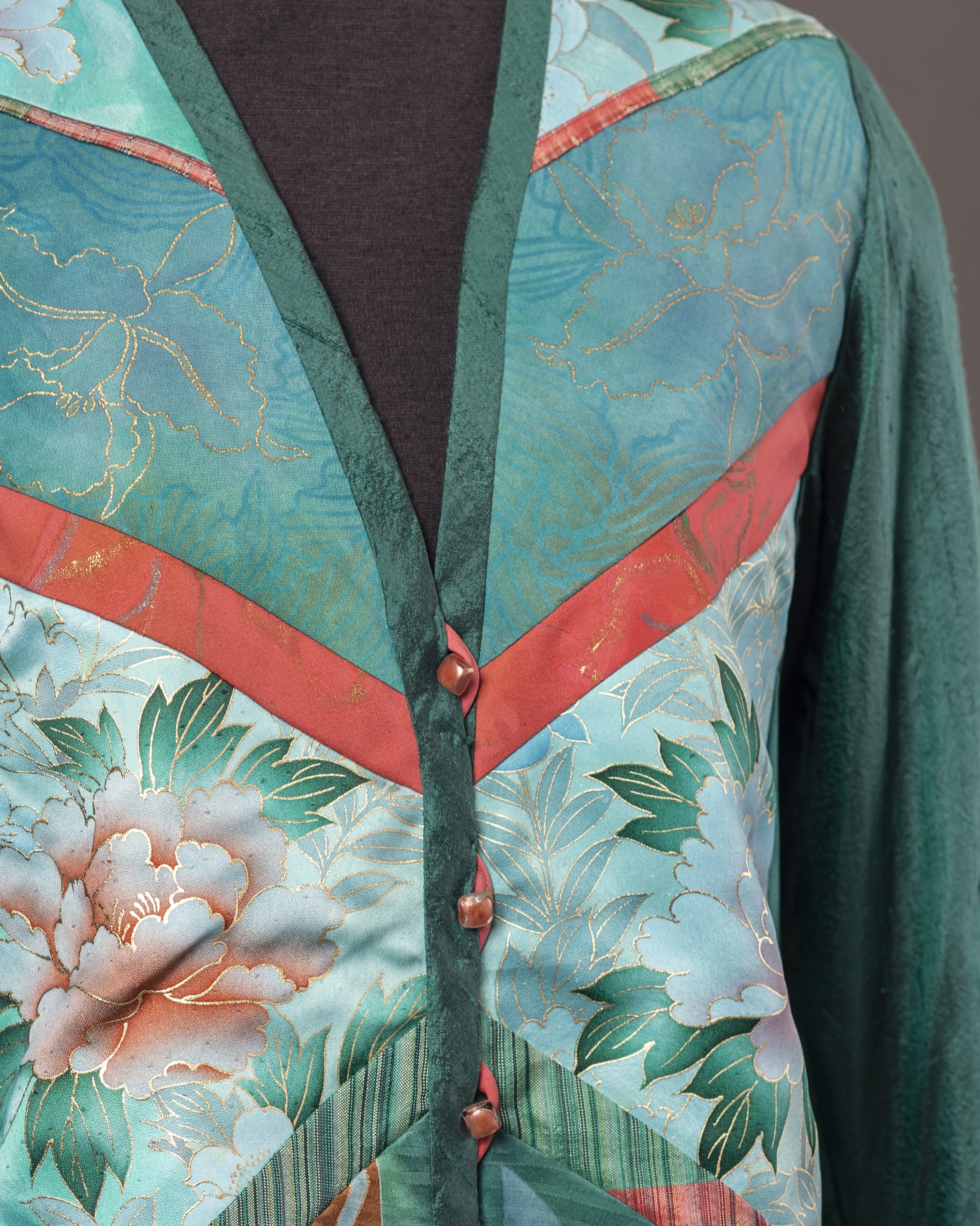 A rich collection of green, aqua and orange kimono silks were pieced together on this Tabula Rasa Jacket using the stitch and flip foundation piecing technique. The jacket is finished with the narrow band found in the Band Variations and Pockets Pattern and the roll back cuff from the Sleeves and Cuffs Variations. The jacket was featured in Threads Magazine 2017 Softly Piecing article and in the online extra Intriguing Details for Pieced Garments. The drapey silks were stitched and flipped to a silk crepe de chine base so it is light weight with a lovely soft hang. The beauty of this piecing method is that the bias piecing is smoothly stable because of the straight of grain base under the decorative sections. Read more about this jacket in the Samples for Threads blog post. Read more about the stitch and flip quilting technique in the post Stitch and Flip Engineering.
