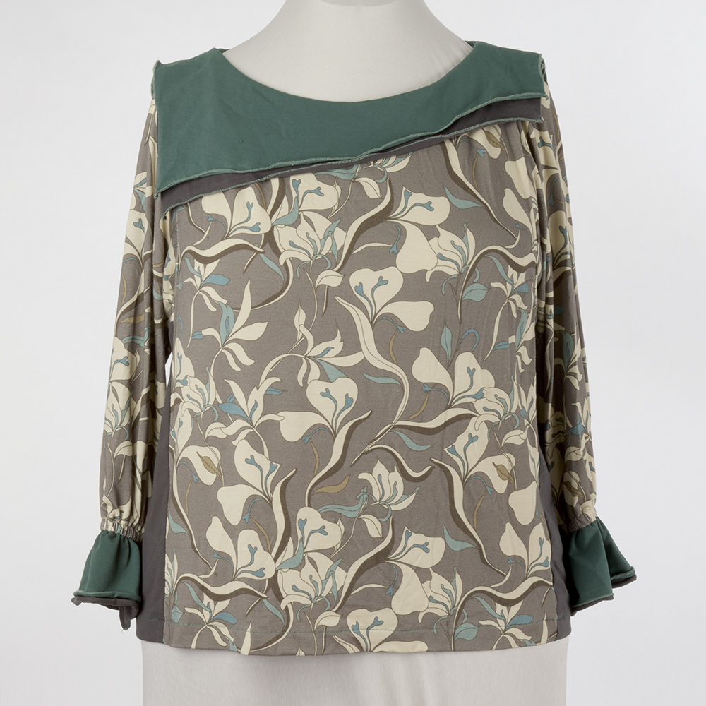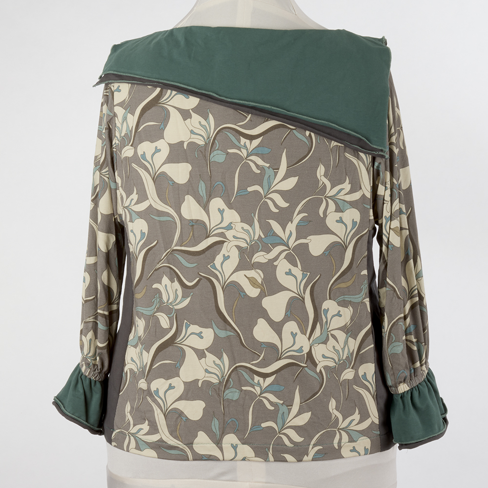 Dreamy muted shades of taupe, green and ivory in this modern floral jersey print stitched up beautifully using the Tabula Rasa Knit Tee & Tunic with angled collars from the Wide Neckline Variation pattern. The stacked collars and cuffs in green and gray are finished with a tiny rolled edge on the serger keeping this top light and lovely. Purchase this print in our store while supplies last. Read more about Wide Neckline Variations on the blog.