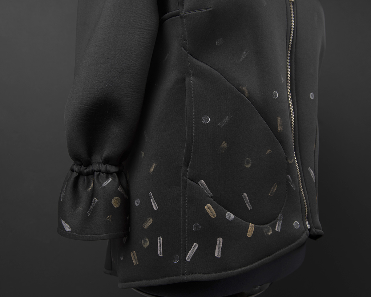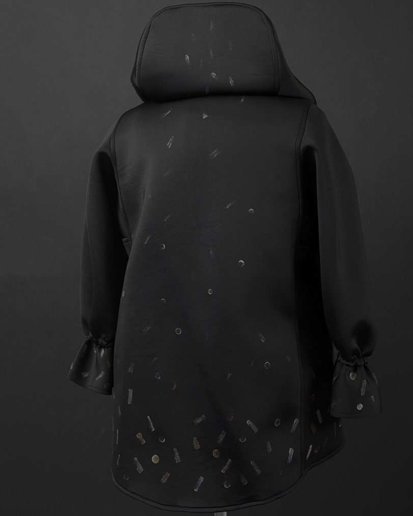 This neoprene jacket is a great piece for fall and spring weather because the scuba knit is warm and water resistant in cool weather. Rae has made the solid black fabric more interesting by embellishing it with a simple brush design in metallic fluid textile paints. The Tabula Rasa Jacket incorporates several features of the Rain or Shine Variations, including the zip front, hood, swing back, inseam pockets, and elastic cuffs. Read more about her design and construction process in Sew and Paint Neoprene.