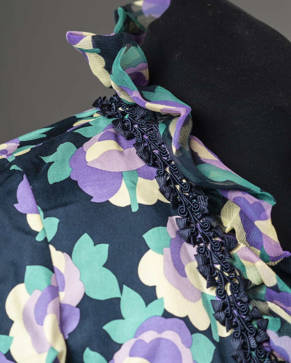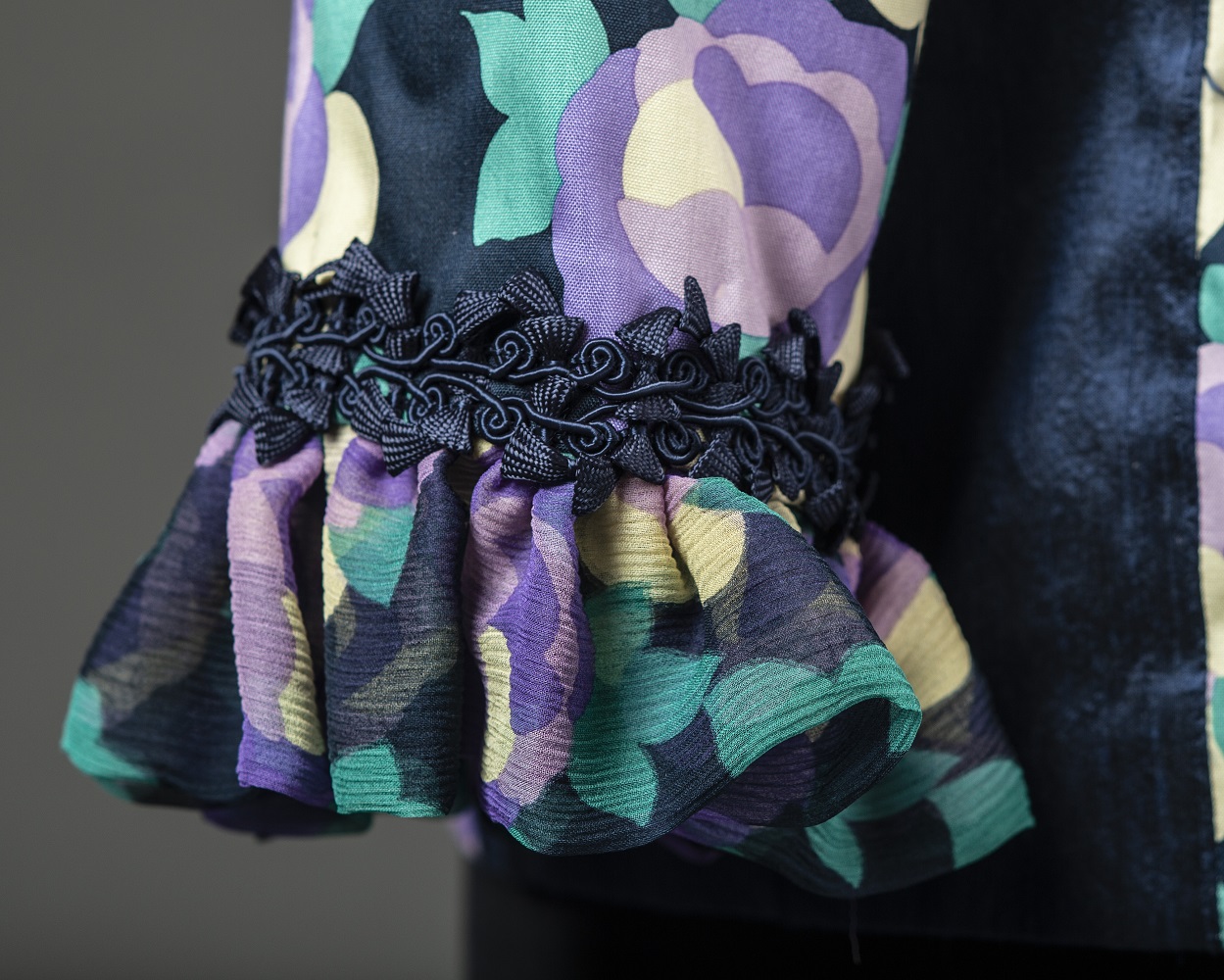 When Rae spotted this colorful silk twill print and the matching crinkle chiffon on a New York shopping trip, she knew if had to be a Ruffled Band Version of the Tabula Rasa Jacket. The directions for the opulent detail is found in the Band Variations patternBand Variations for the Tabula Rasa Jacket – Digital available for digital download. The ruffled chiffon was also used as a cuff and finished with some lovely passementarie trim. Read more about this jacket’s ruffles in the Chiffon Ruffles post and it’s partial lining in the post Cool Partial Linings.