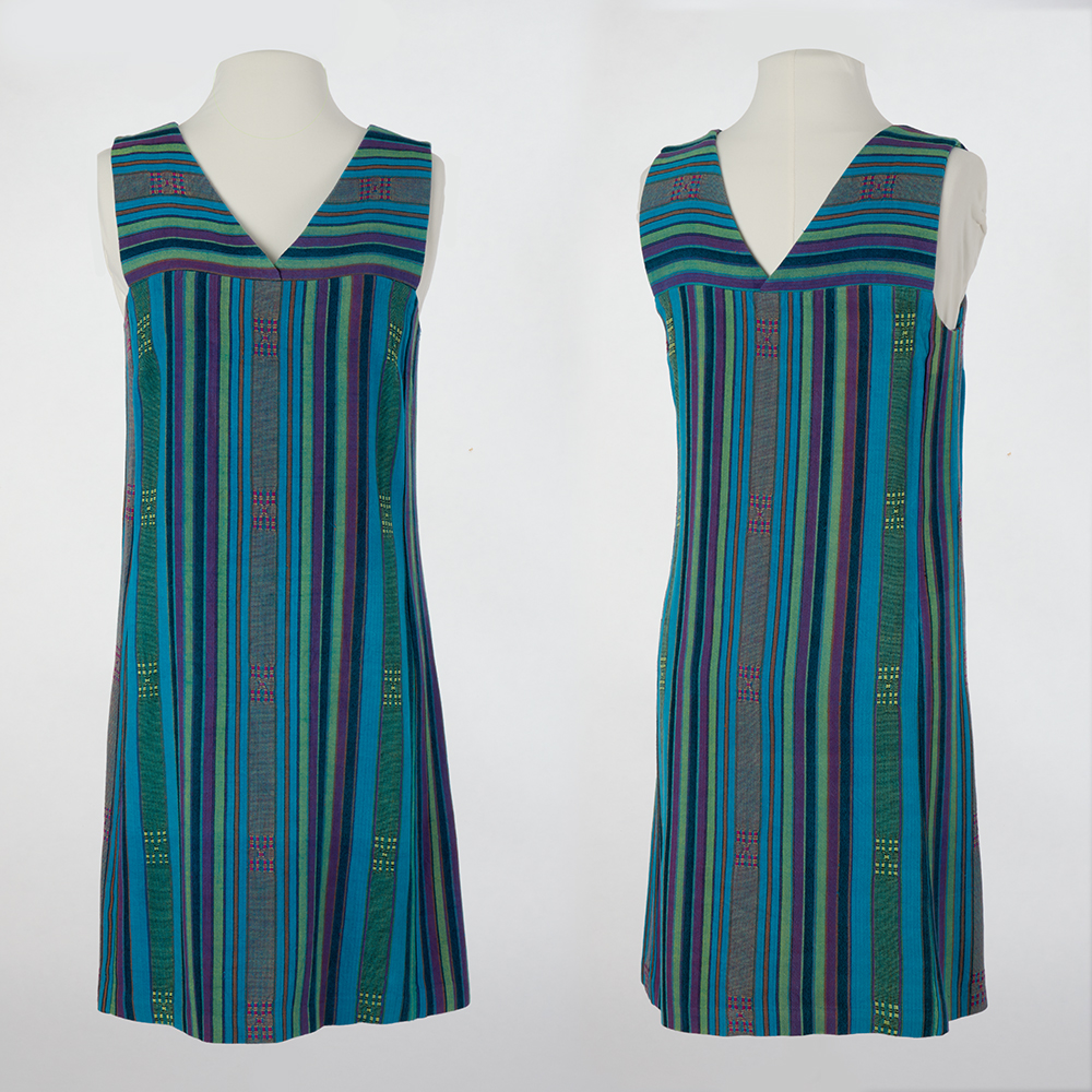 This dress was Carrie’s first test of the Crossover V Yoke style included in V Neckline Variations for the Carpe Diem Dress & Tunic, and a lesson in how much V is too much! The front and back Vs of the final pattern are more modest than you see here, but it provides such fun inspiration for playing with stripes in the Crossover V Yoke that we couldn’t leave it out. The fabric is a beautifully drapey handwoven rayon that Carrie picked up during her travels in Indonesia, from the same village as the pink plaid sewn into the Notched Carpe Diem Tunic.