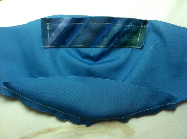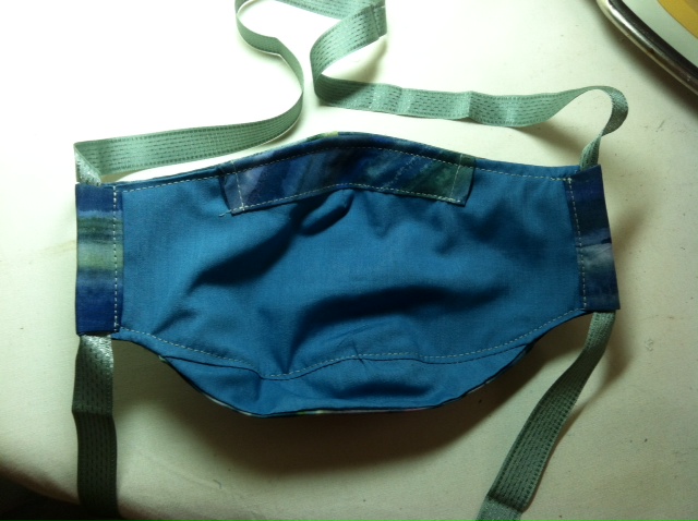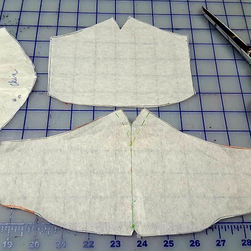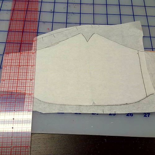Use your pattern to draft a filter pocket pattern that is 2″ narrower at both ends but otherwise is the same of the base pattern.  Cut out the pattern and then cut out fabric to make the pattern.