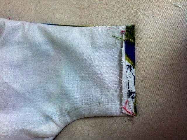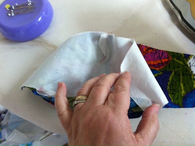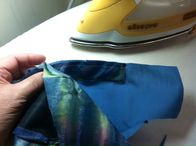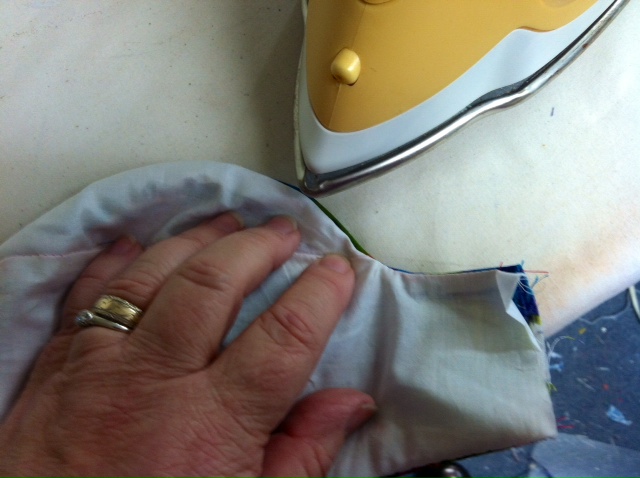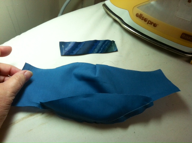 While at the iron, fold and press in the casings that will hold the ties.  First press all layers ¼” inch to the lining side.  Then press an additional ½” for a neat casing fold.