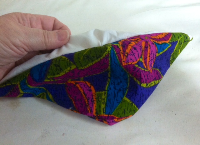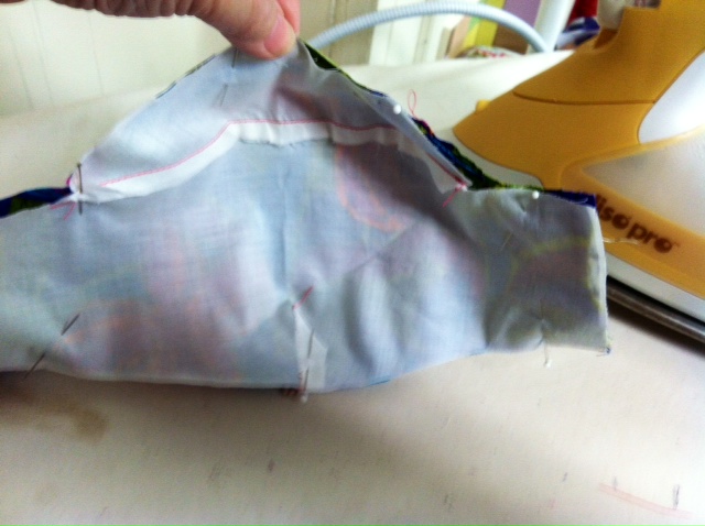 Press with an iron or finger press the darts and seams to one side.  If you press the lining seams one direction and the fabric seams to the other direction, the bulk in the seams will be lessened.   (For removable wire casings, move now to the direction appendix and insert the casing before sewing the mask together.)