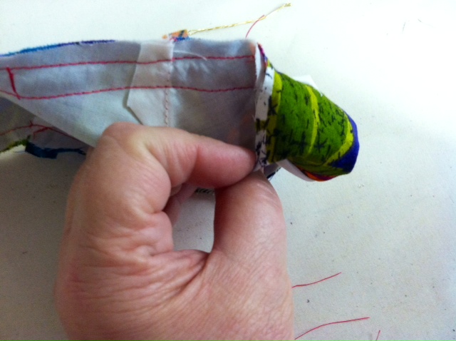 Stitch a 4” long wire casing into the wider seam allowance across the slope of the nose.  Start along the seam line and backstitch.