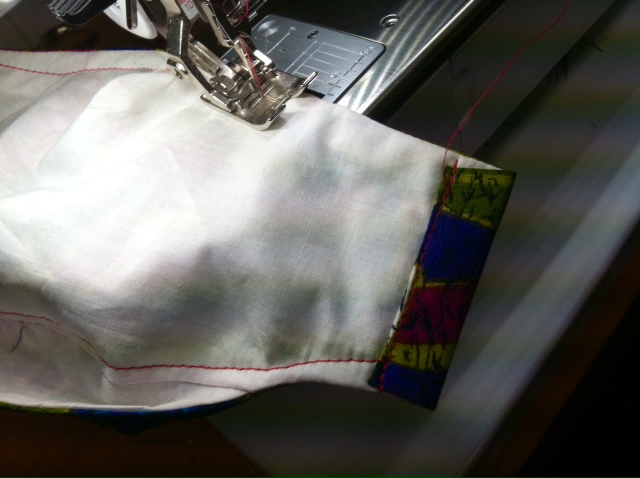 Then turn the mask and stitch across one long edge to the other tie casing.