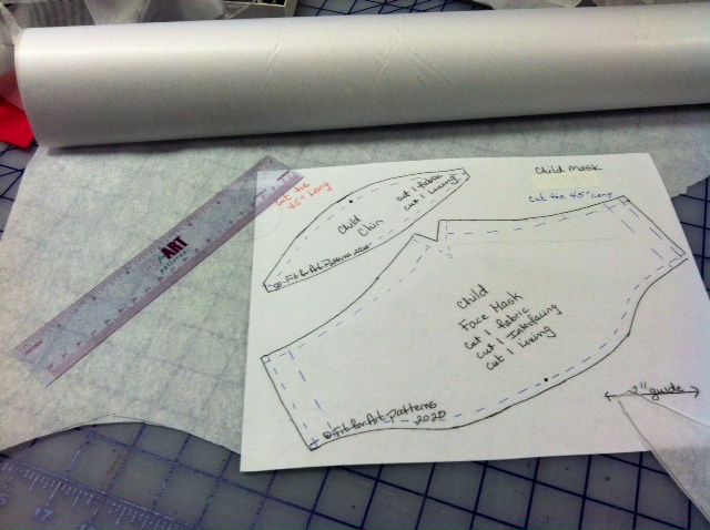 Cut out the pattern pieces, or copy them onto pattern tissue, depending on how you plan to cut out the fabric.  If you will draw the pattern onto the fabric before cutting, simply cut it out of copy paper or card stock.  You may also order a template ruler for the original size mask from Pam Damour’s website so it is easy to cut with your rotary cutter.